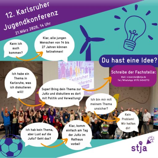 Die Karlsruher Jugendkonferenz ist DEIN Ort für DEINE Ideen für Karlsruhe! Sie bietet allen Jugendlichen aus Karlsruhe die Chance, ihre Ideen, Wünsche, Anliegen und Kritikpunkte einzubringen und diese gemeinsam mit Vertreter*innen aus Politik und Stadtverwaltung zu diskutieren.